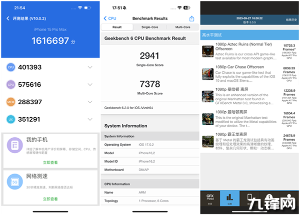 CPU單項測試,GeekBench6單核性能達到2941分,多核性能為7378,相比A16芯片,A17 Pro的單核性能提升了約13.9%,多核性能提升了約11%,大核IPC性能達到778,相比A16提升近4%。