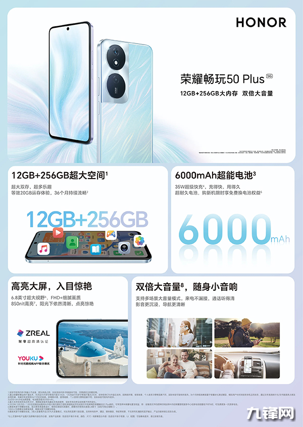 榮耀暢玩50 Plus主打一個(gè)“大內(nèi)存”和“大電池”。手機(jī)內(nèi)置6000mAh電池,支持在線(xiàn)追劇19.5小時(shí),或音樂(lè)外放68小時(shí),或刷短視頻19小時(shí),輔以35W超級(jí)快充,真正告別電量焦慮。配合立體聲雙揚(yáng)聲器,可以帶來(lái)劇院般的聽(tīng)感。還支持多場(chǎng)景大音量模式,來(lái)電不漏接、通話(huà)聽(tīng)得清、影音更沉浸、導(dǎo)航更安全。