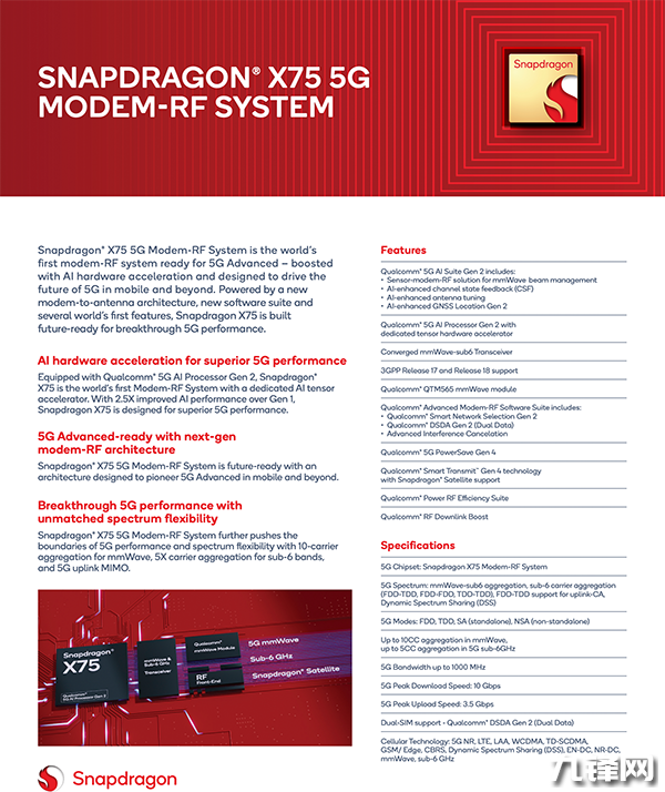 與X70調制解調器相比,X75采用了改進的載波聚合技術和其他先進技術,可提供更快的5G下載和上傳速度,高通還宣稱X75通過將mmWave/Sub-6集成在一塊芯片上,可以比X70多出20%的能效提升。