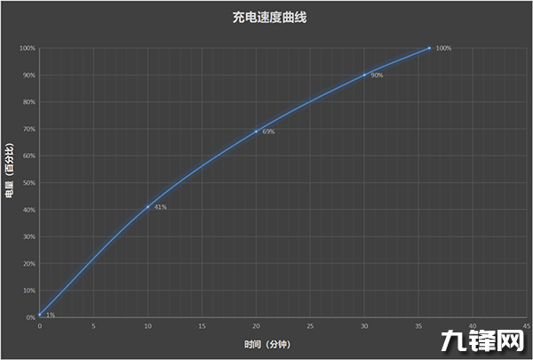 經(jīng)過(guò)測(cè)試,電量從1%開始滅屏充電,10分鐘充至41%,20分鐘充至69%,半小時(shí)電量充至90%,最終完全充滿用時(shí)36分鐘。