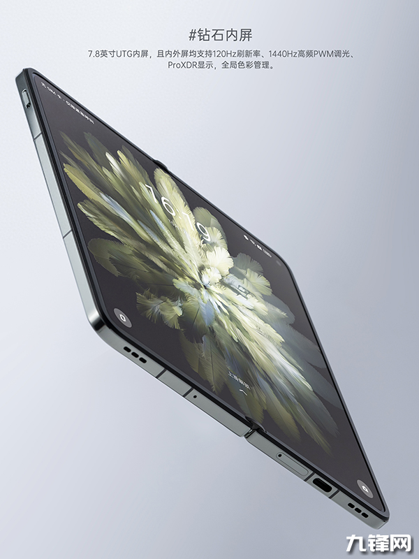 內(nèi)屏:尺寸是7.8英寸,分辨率是2440×2268,OLED材質(zhì),支持120Hz刷新率(LTPO),屏幕比例6:5.6,全屏峰值亮度1400nit、局部激發(fā)亮度2800nit,支持Pro XDR 8倍動(dòng)態(tài)范圍激發(fā),1440Hz高頻PWM調(diào)光,10bit色深,鏡面UTG玻璃;