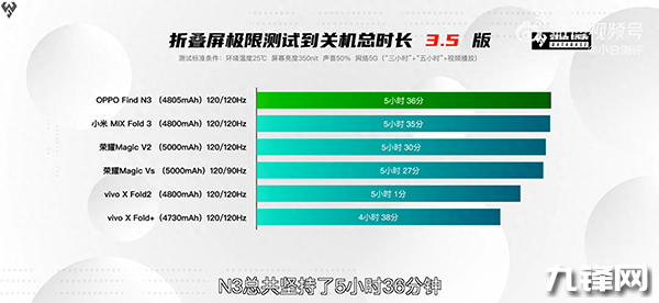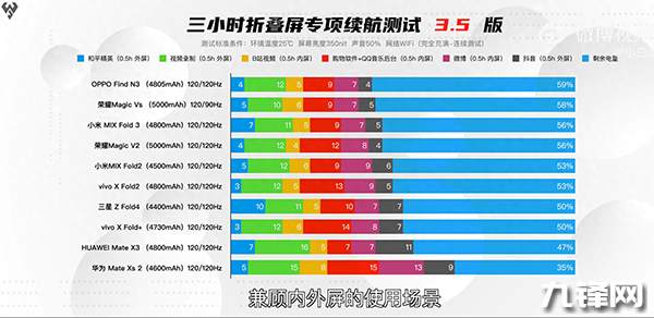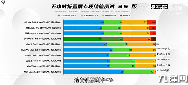 然后是五小時(shí)折疊屏專項(xiàng)續(xù)航測(cè)試,同樣是兼顧內(nèi)外屏使用場(chǎng)景,再加上外屏打王者和內(nèi)屏玩原神的5小時(shí)重度測(cè)試后,OPPO Find N3的電量剩余6%,數(shù)據(jù)庫排名第四,第一名剩余電量10%,差距并不大。
