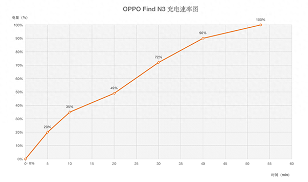 充電方面,將OPPO Find N3放電至關(guān)機(jī),然后開(kāi)始充電。充電5分鐘手機(jī)充入20%的電量、10分鐘充入35%、30分鐘充入49%,30分鐘分鐘充入72%,40分鐘充入90%,53分鐘充滿至100%。當(dāng)然充電的速度會(huì)隨著充電環(huán)境發(fā)生些許波動(dòng),這個(gè)數(shù)據(jù)大家僅供參考。