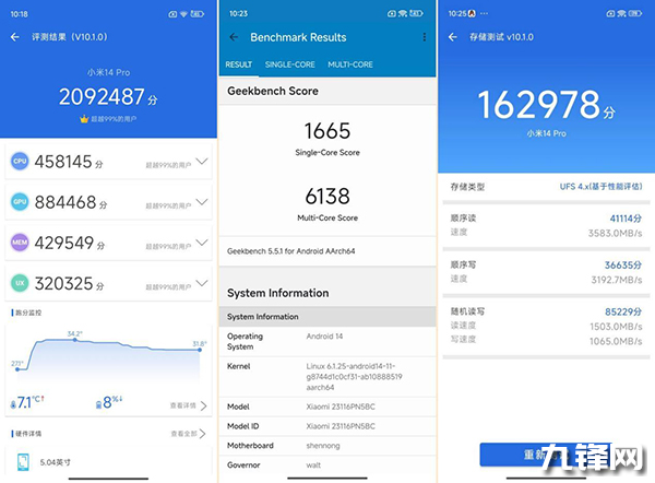 在安兔兔V10.1.0版本中,小米14 Pro成績達到了2092487,其中CPU為458145,GPU為884468,而在GeekBench5中,小米14 Pro單核1665分,多核6138分。