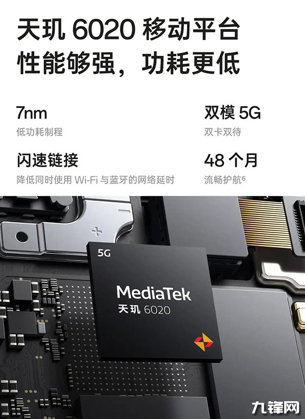 性能:搭載的是天璣6020處理器,采用的是臺(tái)積電7納米工藝,安兔兔V9跑分在33分,屬于低端級(jí)別的性能。