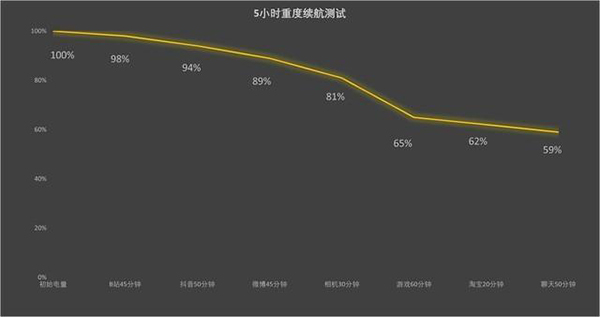 從五小時(shí)重度續(xù)航測(cè)試來(lái)看,從滿電到測(cè)試結(jié)束,最終還能剩余59%的電量,成績(jī)比預(yù)期更好,不僅滿足一整天的中重度使用需求,也意味著藍(lán)海電池效果不錯(cuò),前景可期。