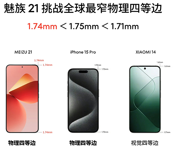 魅族21的物理四等邊不僅窄,而且比小米14的視覺(jué)四等邊和iPhone15 Pro物理四等邊還要窄。小米14是小米公司今年推出的一款旗艦手機(jī),它的屏幕邊框看起來(lái)很窄,但實(shí)際上下邊框的寬度是要略寬于其他三個(gè)邊框的。