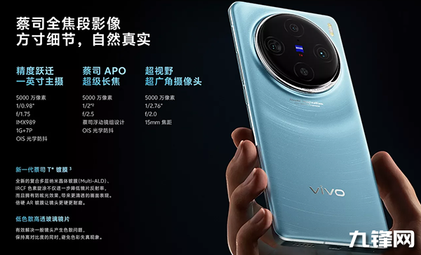 在這個(gè)相機(jī)的配置上,這次的vivo X100 Pro前置3200萬像素,后置5000萬像素主攝+5000萬像素超廣角+5000萬像素潛望長(zhǎng)焦,激光對(duì)焦攝像頭dToF,新一代蔡司T*光學(xué)鏡頭,自研V3芯片。