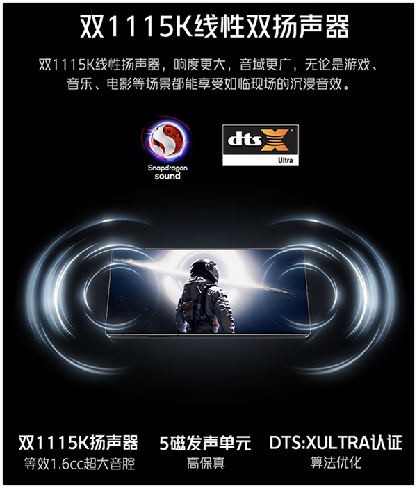 兩個,也就是雙揚聲器,雙1115K超線性揚聲器,在這個音效方面,這次的紅魔9 Pro毫不含糊,采用的是瑞聲科技1115K線性雙揚聲器,大聲場,聲效不錯。