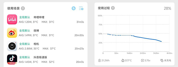 實(shí)際也是進(jìn)行了2小時(shí)日常使用測(cè)試,室溫350nit亮度,WiFi環(huán)境下,刷20分鐘抖音(耗電3%)、進(jìn)行20分鐘視頻錄制(耗電5%)、刷20分鐘微博(耗電3%),再看30分鐘B站1080p視頻(耗電4%),最后進(jìn)行30分鐘王者榮耀(耗電11%),最終共耗電26%,這個(gè)續(xù)航表現(xiàn)還是不錯(cuò)的。