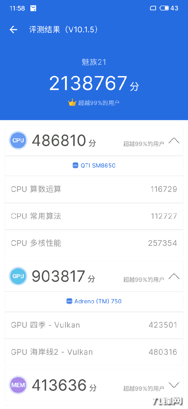 根據(jù)安兔兔實(shí)測,魅族21獲得了超過210萬分的成績。達(dá)到了第三代驍龍8旗艦的應(yīng)有水平,看來魅族的調(diào)校還是很有功底的。相比搭載驍龍8Gen2處理器的魅族20 Pro有著比較明顯的優(yōu)勢。