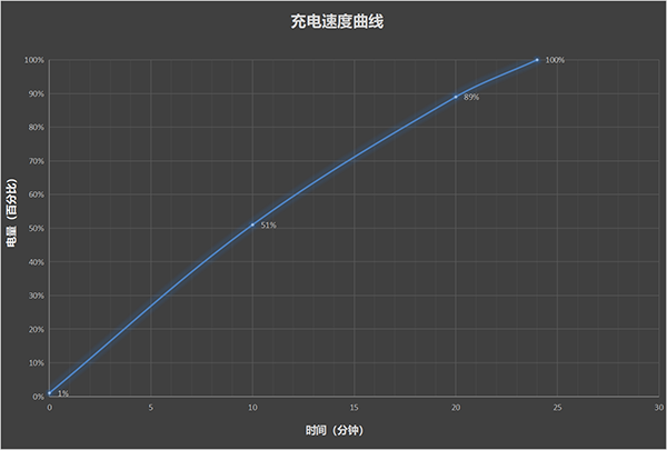 手機從1%電量開始充電,10分鐘電量過半,達(dá)到51%,20分鐘電量達(dá)到89%,最終完全滿電用時24分鐘。