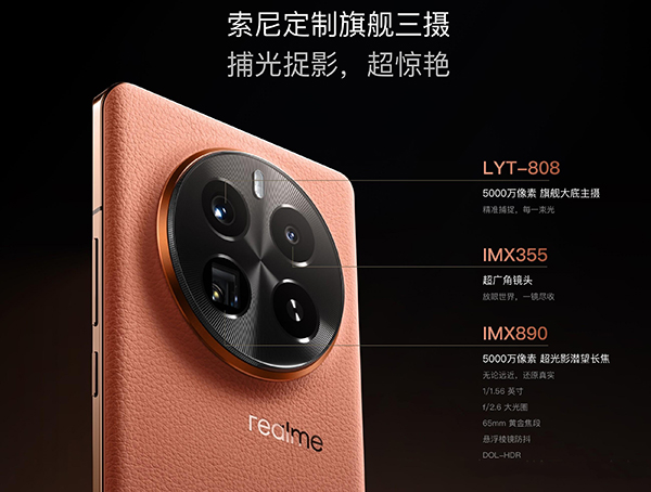在這個(gè)影像方面,真我GT5 Pro影像真的很硬核,潛望長(zhǎng)焦中的王中王,索尼定制的旗艦后置三攝方案:5000萬(wàn)像素大底主攝(索尼LYT-808)+5000萬(wàn)像素超光影潛望長(zhǎng)焦主攝(索尼IMX890,最強(qiáng)暗光長(zhǎng)焦)+800 萬(wàn)像素112° 超廣角鏡頭(索尼IMX355)。