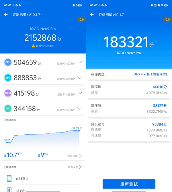 理論跑分方面iQOO Neo9 Pro來到了215萬分,同時(shí)閃存讀取更是突破到了4GB/S,寫入為3.3GB/S,隨機(jī)讀寫也全部超過1GB/S,日常安裝以及文件完全沒有短板。