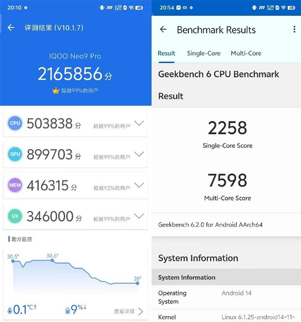 在大家熟悉的安兔兔跑分方面,實(shí)測iQOO Neo9 Pro最高可達(dá)到216萬分+,毫無疑問就是目前安卓手機(jī)陣營里T1甚至T0的水平,在GeekBench6中,單核為2258分,多核為7598分。