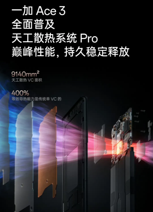 另外,這個一加Ace3還增加了散熱面積,面普及天工散熱系統(tǒng)Pro,VC面積9140m㎡,和一加12、一加Ace2 Pro一樣大。