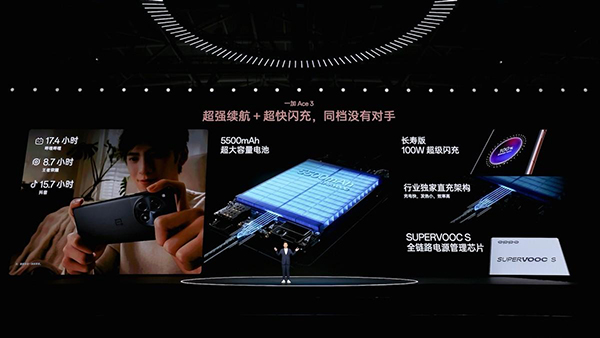 電池方面,一加Ace3搭載5500mAh大電池,配備SUPERVOOCS全鏈路電源管理芯片,支持核心器件功耗優(yōu)化與軟件算法功耗優(yōu)化,電池放電效率提升到幾乎沒有損耗的99.5%,同樣性能表現(xiàn)下,可實(shí)現(xiàn)更低的功耗和更少的放電損耗。