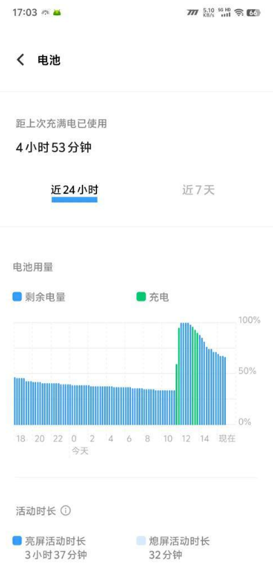 另外,在高強(qiáng)度測(cè)試中,包括30分鐘左右的跑分測(cè)試、30分鐘左右的拍攝測(cè)試、60分鐘的原神游戲等,亮屏共3小時(shí)37分,熄屏32分鐘,最終剩余電量為66%,這個(gè)整體續(xù)航表現(xiàn),基本可以解決“續(xù)航焦慮”問題了。