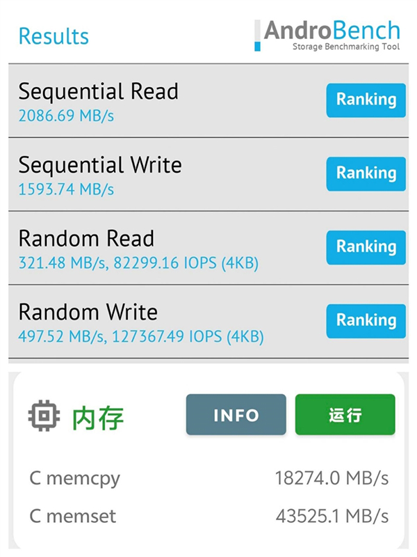 在Androbench閃存測試中,S18 Pro的讀寫速度分別達(dá)到而來2086.69MB/s、1593.74MB/s,屬于UFS3.1規(guī)格的表現(xiàn)。