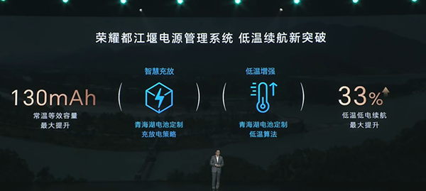 此外,榮耀Magic6系列還首次搭載都江堰電源管理系統(tǒng),常溫等效容量最高提升130mAh,低溫低電續(xù)航最大提升33%,為青海湖電池定制充放電策略、定制低溫算法。