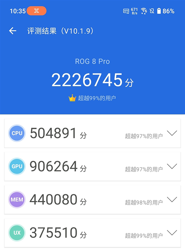 222萬分,這次的ROG 8和ROG 8 Pro在性能配置上都是一樣的,而根據(jù)ATT V10的跑分實則,跑分在222萬,這也是相當高的一個跑分了,目前是旗艦級別的性能。