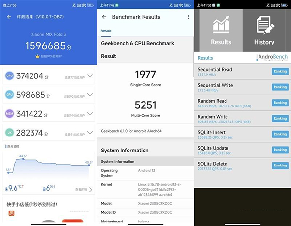 在跑分方面,在安兔兔V10最新版綜合測試中,綜合成績突破了159.7萬,在橫向折疊旗艦手機中屈指可數(shù),相比去年搭載驍龍8+的小米MIX Fold2,綜合性能提升了約48.1%左右。
