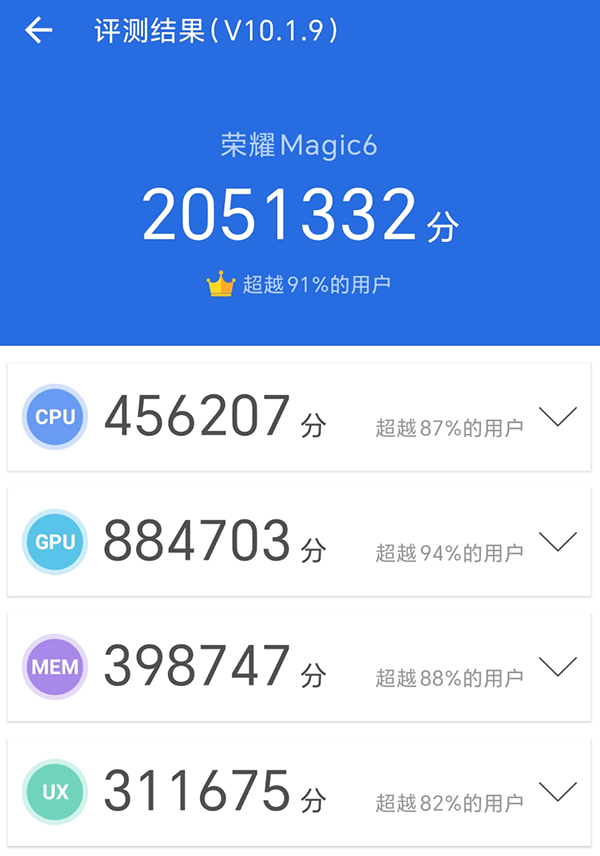 205萬,榮耀Magic6標(biāo)準(zhǔn)版搭載了驍龍8Gen3處理器,在安兔兔V10中跑出到205萬的分?jǐn)?shù),和小米14跑分接近,目前都是屬于旗艦級別的性能水平。