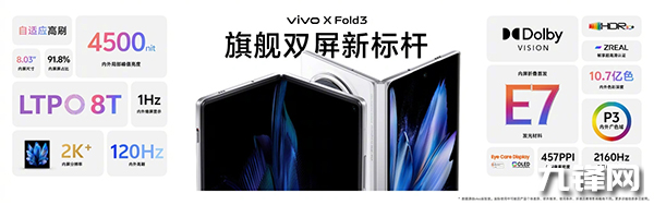 而在這顯示屏上,這次的vivo X Fold3的屏幕號稱為 “全球最強最貴的8英寸三星E7屏”,碾壓所有的折疊屏手機。其中內(nèi)屏尺寸8.03英寸,采用三星E7發(fā)光材料,色彩精準(zhǔn)功耗更低,并且局部峰值亮度為4500nit,另外還有6.53英寸的外屏,是京東方Q9+發(fā)光材質(zhì),局部峰值亮度也是4500nit。