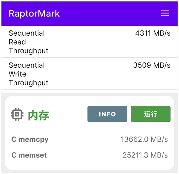 在內(nèi)存性能測試中,復(fù)制速度為13662MB/s,寫入速度為25211.3MB/s。