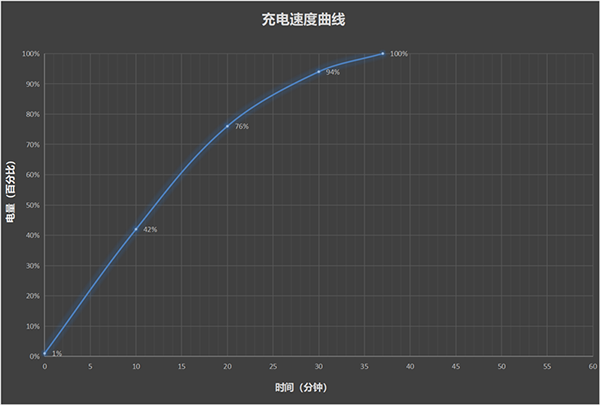 經(jīng)過實測,電量從1%開始充電,10分鐘充至42%,20分鐘充至76%,半小時充,94%,最終完全充滿用時37分鐘。