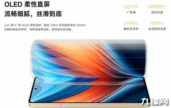 在顯示屏上,它配備了一塊6.67英寸超細(xì)四窄邊OLED柔性直屏,分辨率為2460 × 1080,全局激發(fā)亮度高達(dá)1000尼特。它支持60、90、120Hz刷新率以及瞬時2160Hz觸控采樣率,采用1920Hz高頻PWM調(diào)光技術(shù),并具有10bit色深。
