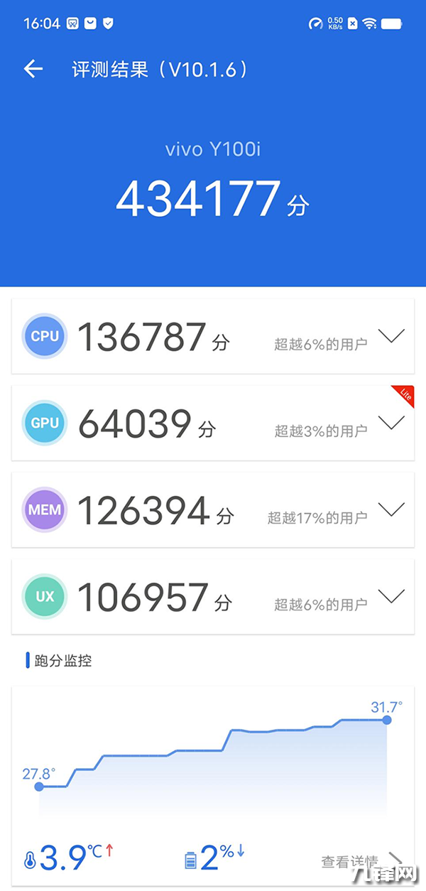 總的來看,這個vivo Y100i在安兔兔V10中的跑分是43萬分。