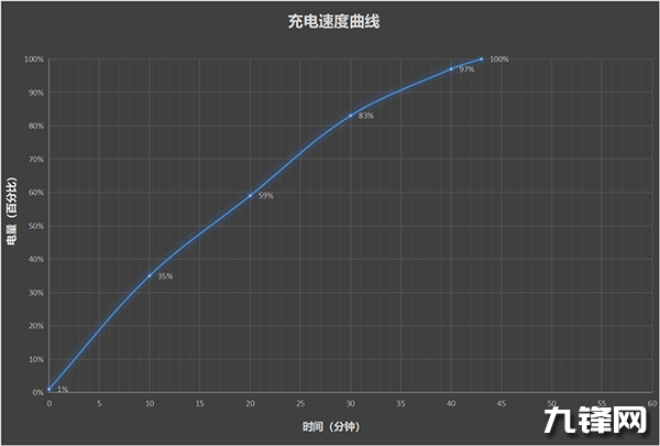 充電實(shí)測(cè),手機(jī)從1%開始充電,10分鐘充電至35%,20分鐘電量過(guò)半,達(dá)到59%,半小時(shí)電量充至83%,最終完全充滿用時(shí)43分鐘。