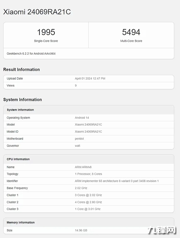 在跑分方面,這個紅米Turbo3跑出出爐,搭載的驍龍8s Gen3,16GB RAM,GeekBench6中單核1995分,多核5495分。