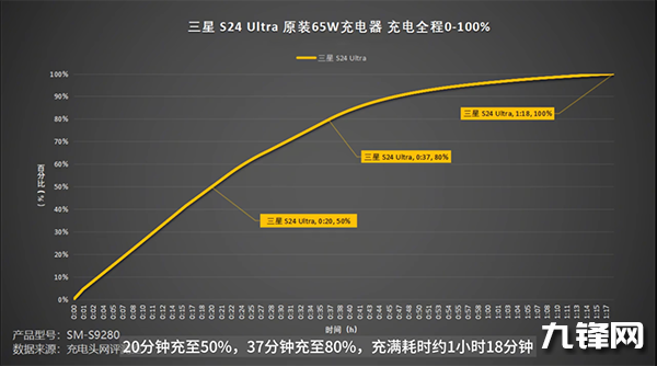 1小時(shí)18分鐘,需要注意的是,三星S24 Ultra本身并沒(méi)有配置充電頭,只有充電線,因此這個(gè)充電頭需要自行購(gòu)買(mǎi),不管什么購(gòu)買(mǎi)什么樣的充電頭,手機(jī)身本最高只支持45W的有線快充,可以說(shuō)這個(gè)充電功率并不大,在這是里測(cè)試用的是三星的65W的充電頭(自行購(gòu)買(mǎi)充電頭)給S24 Ultra來(lái)進(jìn)行進(jìn)行充電測(cè)試,37分鐘80%、1小時(shí)18分充滿(mǎn),這個(gè)充電速度上相比國(guó)產(chǎn)手機(jī)來(lái)說(shuō)是比較慢的。