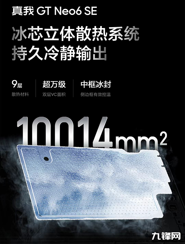 10014mm2,在散熱方面,realme真我GT Neo6 SE搭載超萬級散熱VC,有著9層散熱材料,10014mm2散熱VC面積。