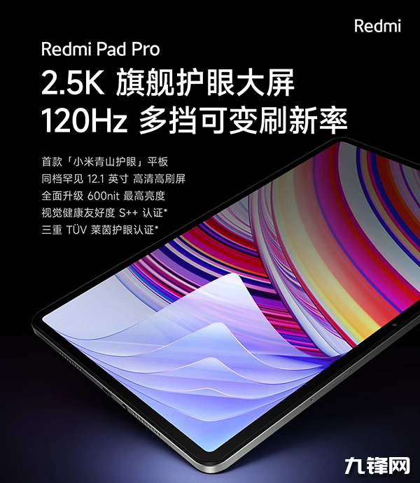 紅米Pad Pro配置了12.1英寸大屏,并且是LCD材質(zhì),屏幕支持2.5K分辨率、120Hz多擋可變刷新率,全面升級(jí)600nit最高亮度,獲得中國(guó)質(zhì)量認(rèn)證中心視覺健康友好度S++認(rèn)證、三重萊茵護(hù)眼認(rèn)證等。