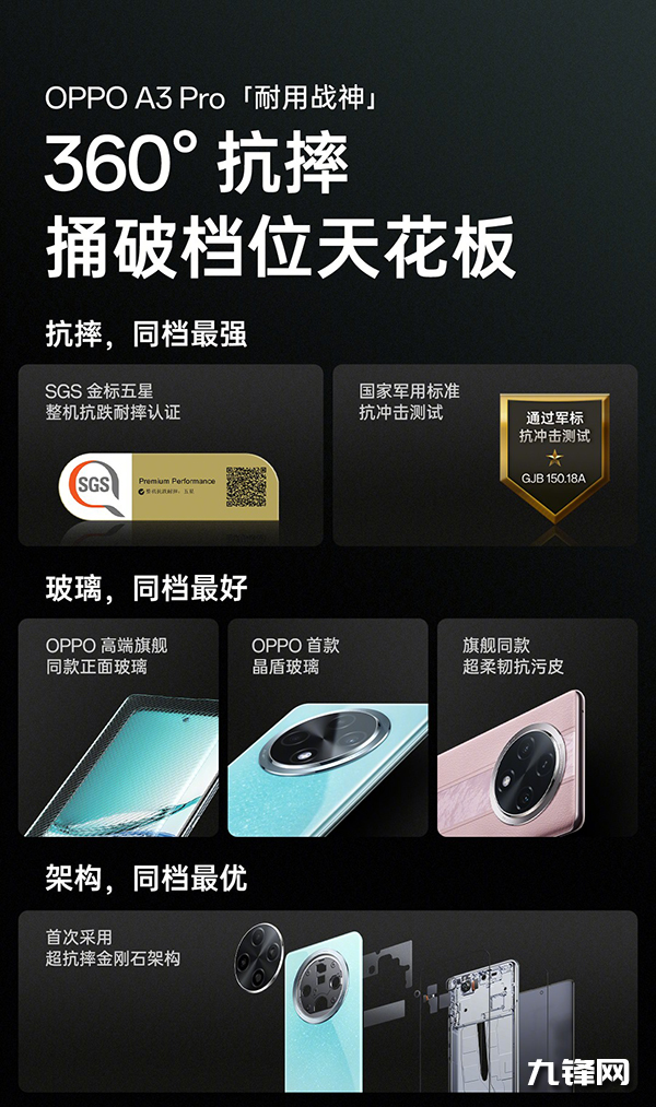 作為OPPO A系列的機型,這個OPPO A3 Pro可以說是內外兼修,并且它也是首個獲得瑞士SGS金標五星整機抗跌耐摔認證并取得測試滿分的手機。
