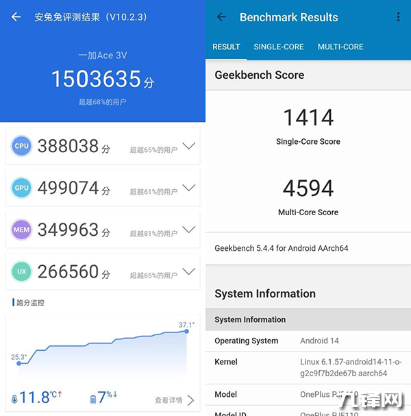 在安兔兔測試中,一加Ace3V跑出了150萬+的分數(shù),在GeekBench5的測試中,單核成績1414分,多核成績4594分,這個成績還是不錯的。