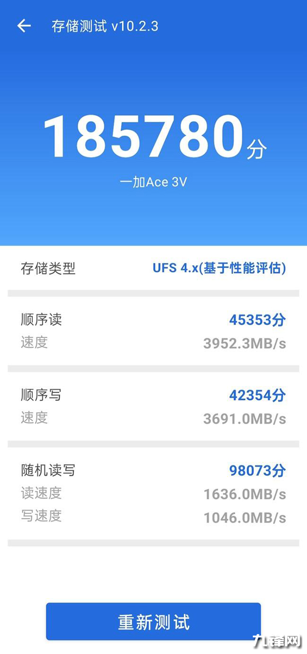閃存測試中,一加Ace3V的寫入速度達到了3691MB/s,讀取速度達到了3952MB/s,滿血USF4.0的表現(xiàn),在安兔兔的存儲測試中也是達到了18.5萬分的分數(shù)。