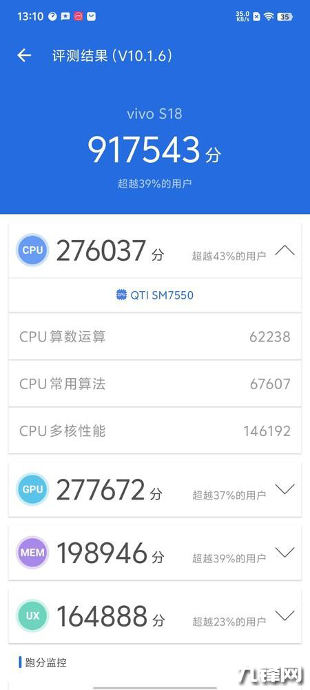 經(jīng)過安兔兔實測,搭載驍龍7Gen3處理器的vivo S18跑出了91萬分的成績,表現(xiàn)符合預(yù)期。