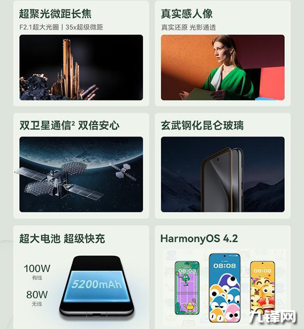 其它:支持IP68防塵防水(抗2m水深),立體聲雙揚聲器,星閃技術,雙頻GPS,0809 X軸線性馬達,WiFi6、藍牙5.2、USB Type-C,USB 3.1 Gen1,支持DP1.2,紅外遙控、NFC、屏下光學短焦指紋、北斗衛(wèi)星圖片消息+衛(wèi)星通話,搭載HarmonyOS4.2系統(tǒng)。