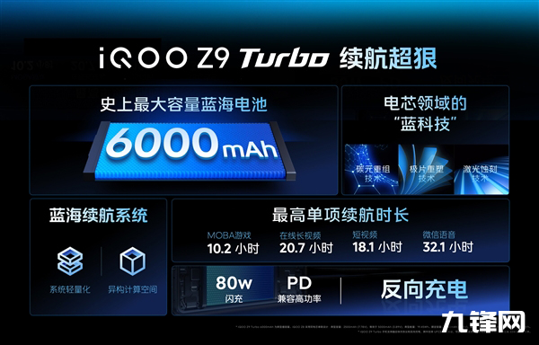 續(xù)航:6000mAh電池容量(單電芯),首發(fā)超薄藍(lán)海電池(寧德),支持80W有線快充,最快5分鐘充入1000mAh;
