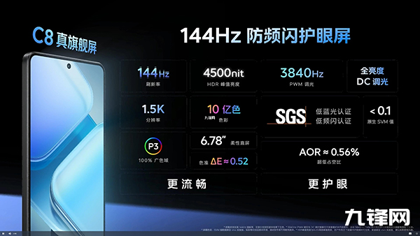 屏幕:尺寸是6.78英寸,分辨率是2800×1200(屬于1.5K級別),柔性O(shè)LED直屏(取消了屏幕塑料支架),屏幕供應(yīng)商是華星光電,C8發(fā)光材料,452 PPI,144Hz高刷新率,LTPS(非LTPO),2000Hz瞬時觸控采樣率,全程類DC調(diào)光或低亮度3840Hz高頻PWM調(diào)光,局部峰值亮度4500nit,支持10億色顯示,濕手觸控,低位短焦指紋;
