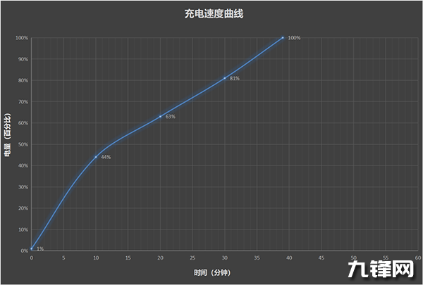 這么大的電池,充電速度肯定是大家比較關(guān)心的,經(jīng)過(guò)滅屏測(cè)試,從1%開(kāi)始充電,10分鐘電量充至44%,20分鐘電量已過(guò)半,達(dá)到36%,半小時(shí)電量充至81%,最終完全充滿用時(shí)39分鐘。