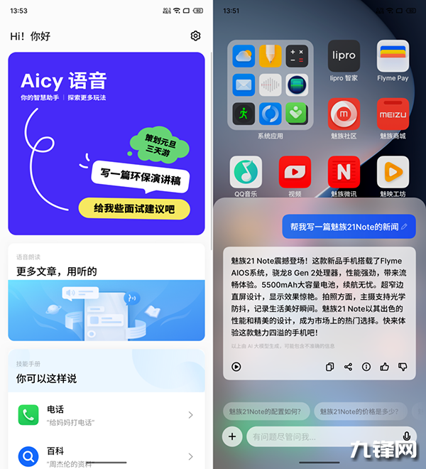 由于魅族21 Note并未搭載最新的Flyme AIOS,而從官方的發(fā)布會來看,新的系統(tǒng)亮點頗多,在AI的應(yīng)用上還支持AI桌面搜索、生成壁紙、連麥對話、打碼、筆記創(chuàng)作、全局錄音、客服對話等。