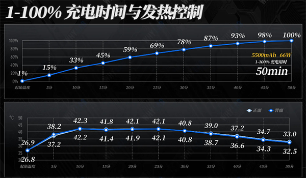 也就是說,這個手機配置的是66W有線快充,功率并不算大,充滿一次耗時50分鐘,充電前30分鐘發(fā)熱基本維持在40°C上下,相比續(xù)航,充電的成績沒那么亮眼。