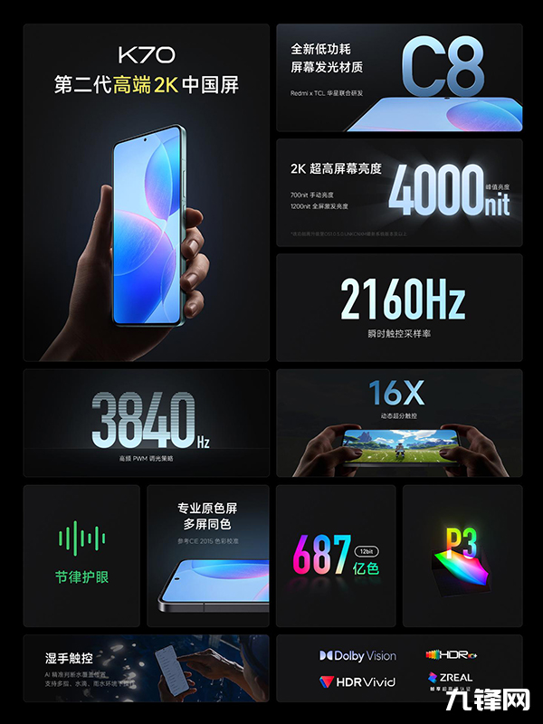 作為一款性能機,這次的紅米K70搭載的是2K分辨率的直屏,繼續(xù)延續(xù)了K系列的屏幕領(lǐng)先感,與以往不同的是,它不僅僅是做一代好屏,而是代代好屏的承諾。這次,Redmi K70的屏幕強度更加離譜,擁有4000nit的峰值亮度和3840Hz的護(hù)眼調(diào)光頻率,這兩項參數(shù)同時達(dá)到了行業(yè)的巔峰水平。