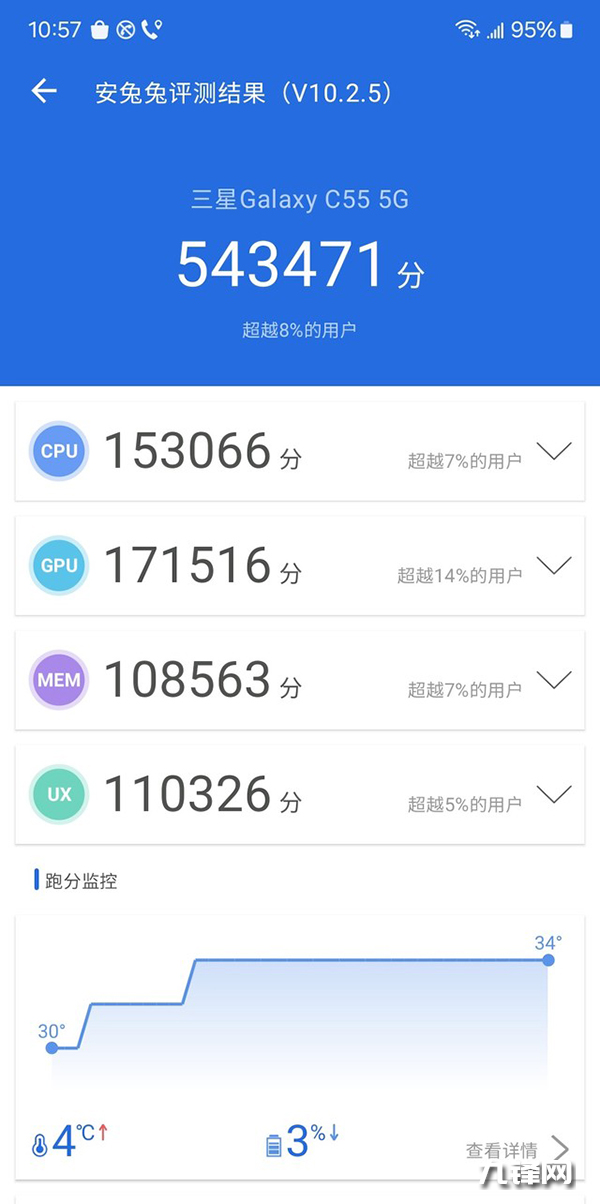 大家關(guān)心的跑分方面,經(jīng)過實(shí)測(cè),三星Galaxy C55 5G安兔兔跑分為543471分,性能跑分上并不高,不過足以滿足日常使用。