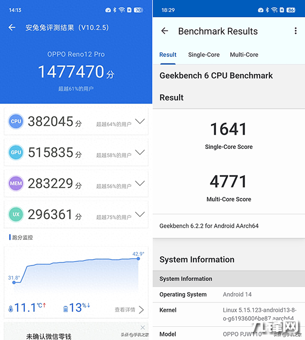 跑分方面,經(jīng)過實(shí)測,OPPO Reno12 Pro在安兔兔中的跑分在147萬,Geekbench6的多核成績?yōu)?771分,單核成績?yōu)?641分。